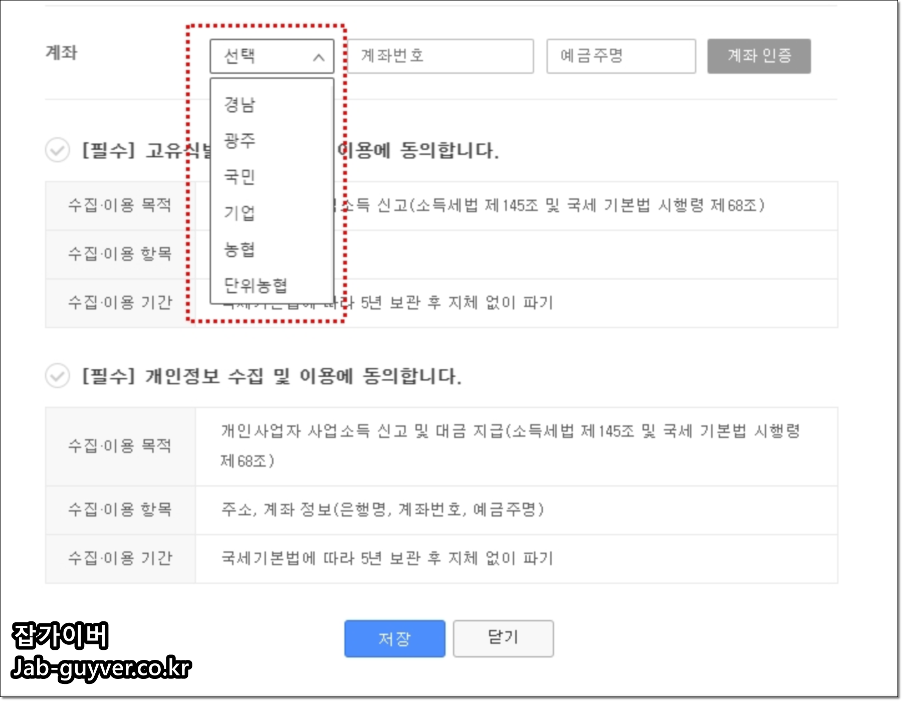 주민등록번호와 주소 그리고 은행계좌를 등록합니다.