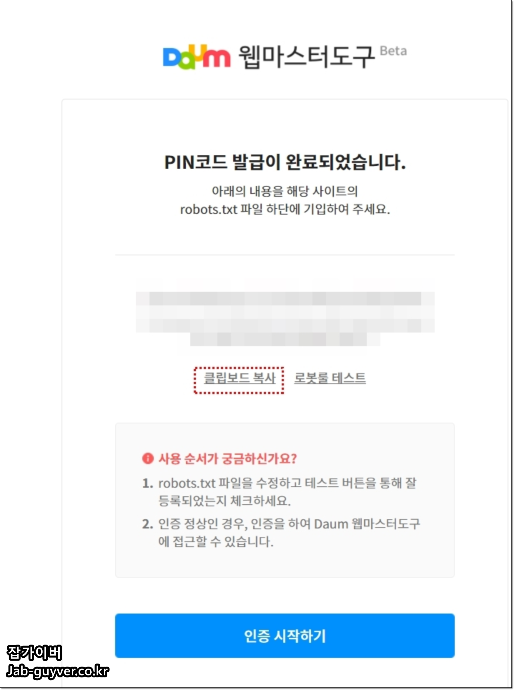 이후 핀코드가 발급되었다면 해당 코드를 복사해서 robots.txt 파일에 업데이트해야합니다.