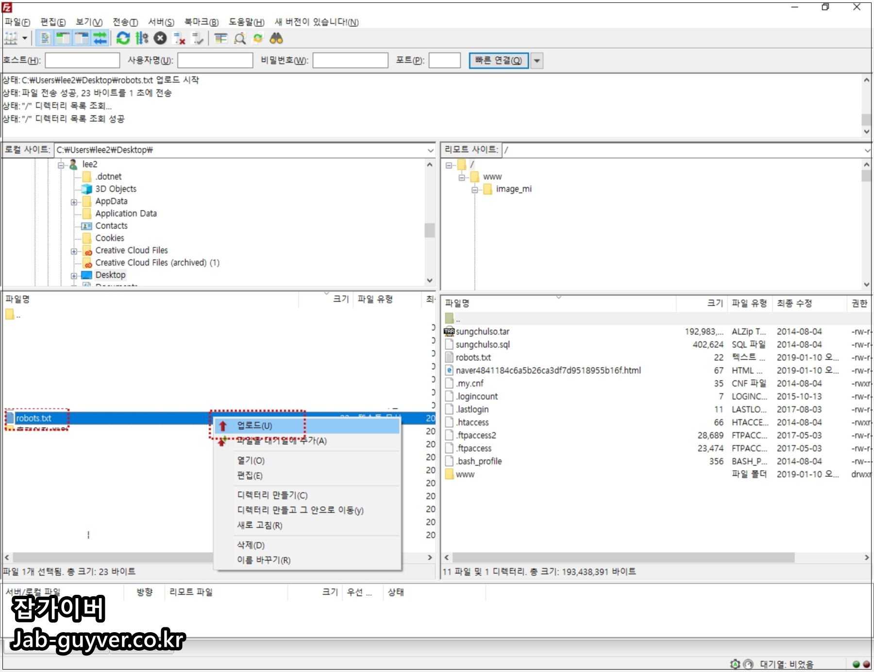 이 후 최상위 위치에 robots.txt 파일을 업로드합니다.