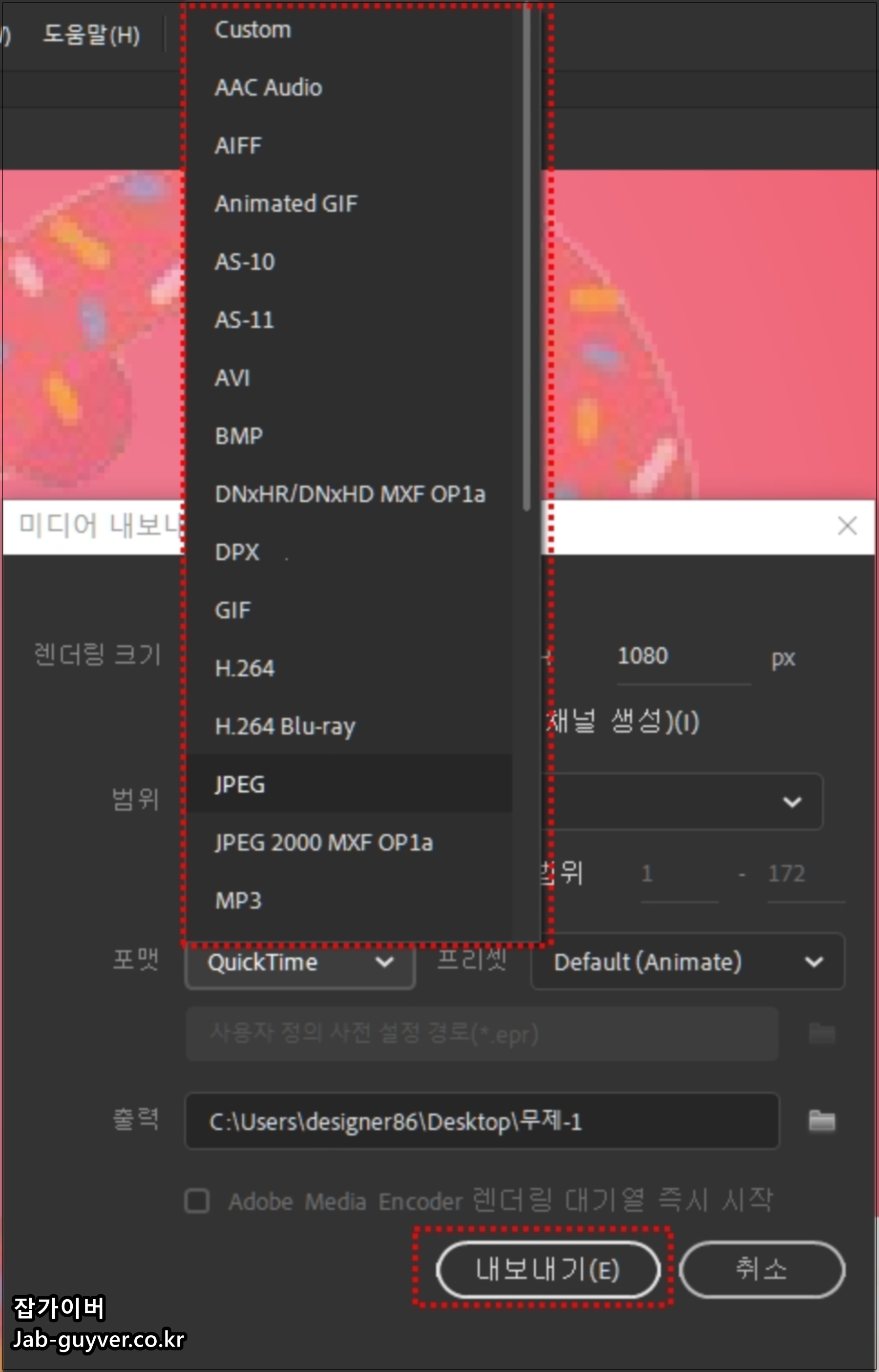 그외 동영상 포맷을 원한다면 AAC Audio AIFF Animated GIF as-10 as-11 AVI BMP DPX GIF H.264 H.264 Blue ray jpeg mp3 mp4 Mpeg 등등 다양한 포맷으로 내보내기가 가능합니다.