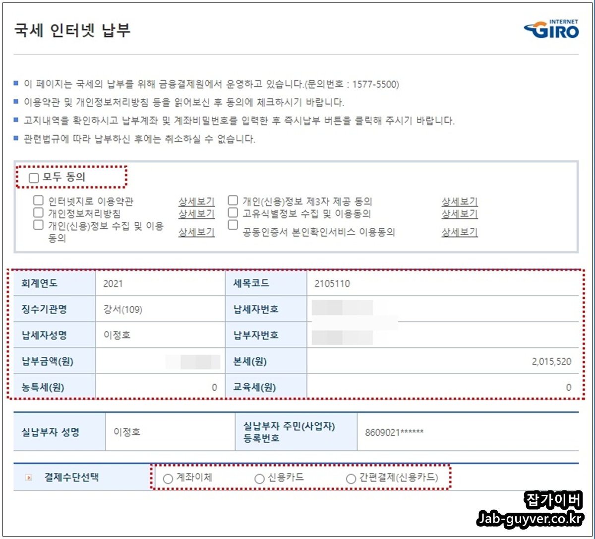 지방세는 회원본인 납부 및 타인납부가 가능하며 본인 외 다른 계좌나 카드로 결제하기 원한다면 타인납부를 선택해야합니다.