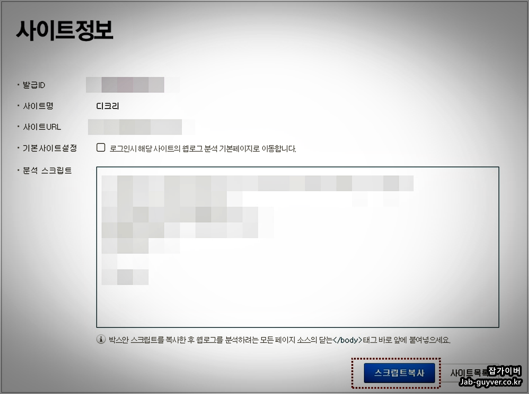 위 코드를 함께해서 코드사이에 네이버 애널리틱스 소스코드를 함께해서 삽입합니다.