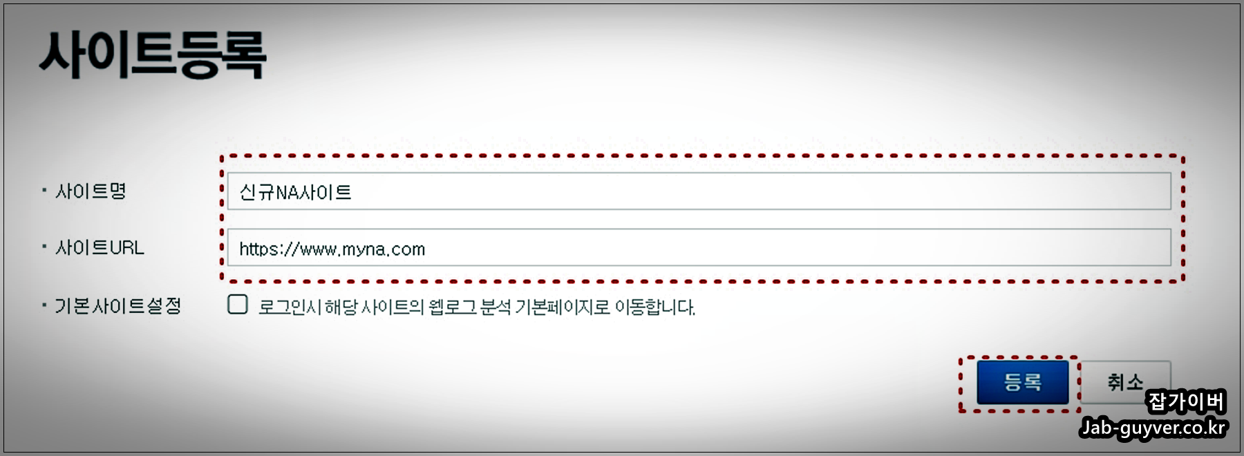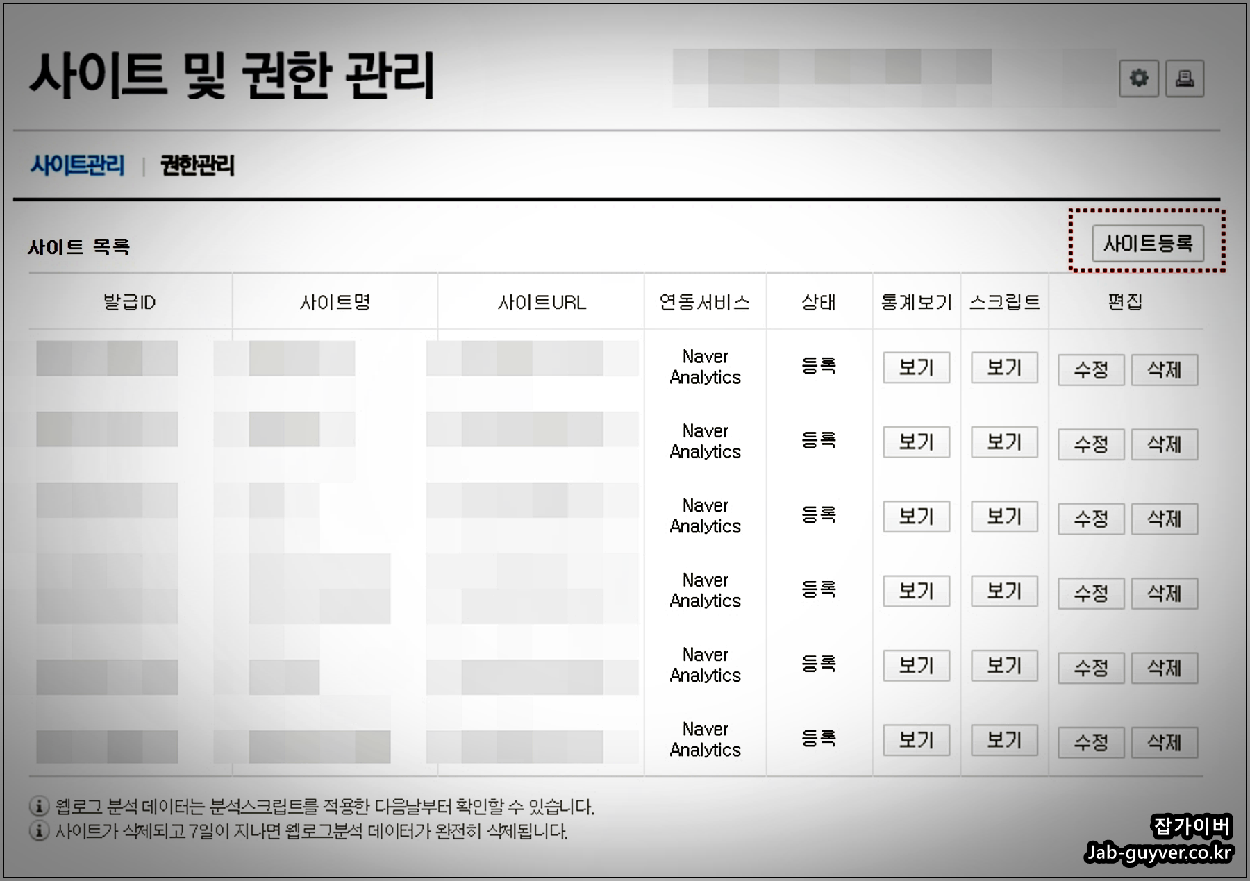 우측 상단 사이트 등록을 선택해서 사이트명과 워드프레스 주소를 입력합니다.