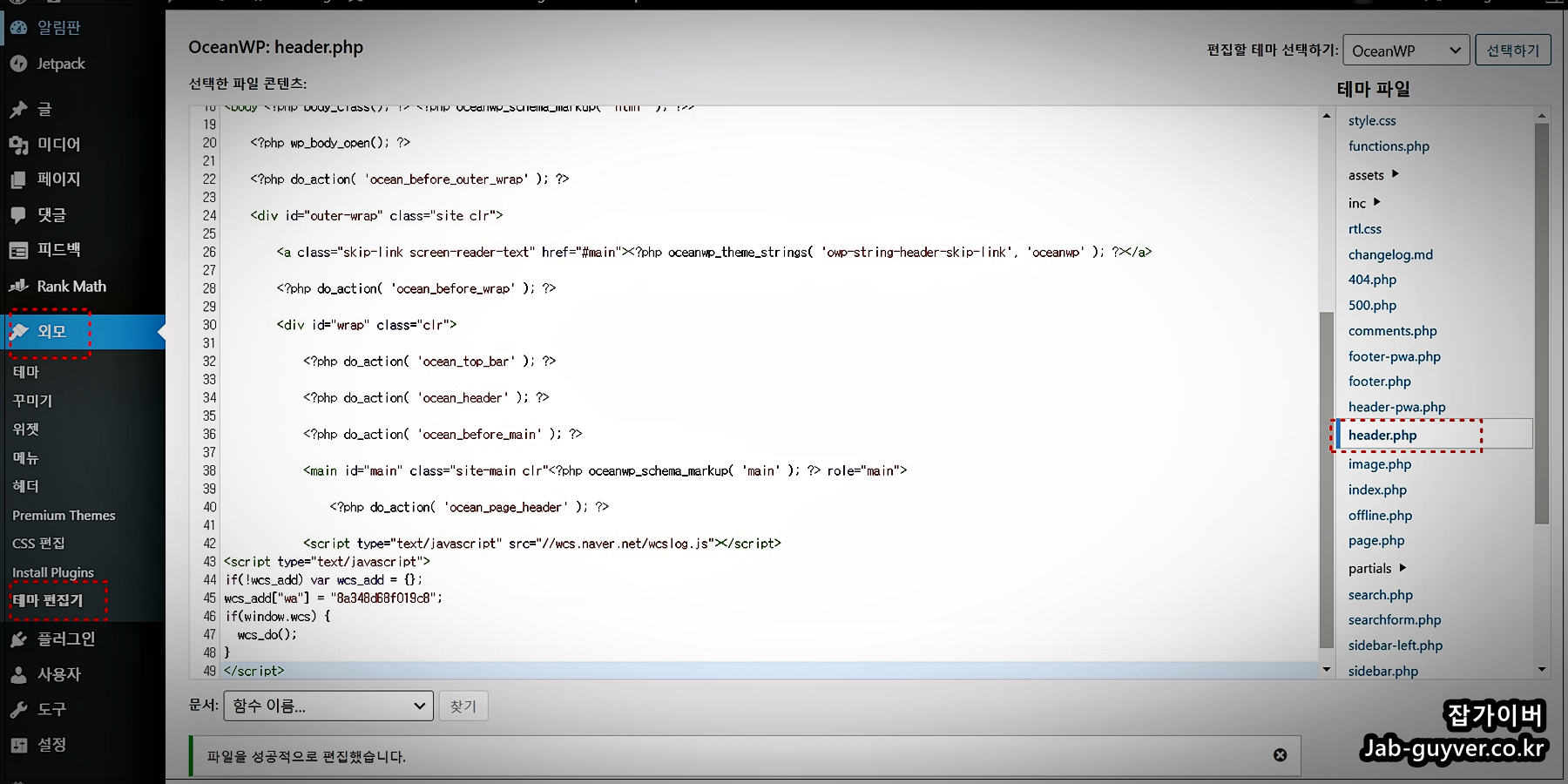 워드프레스 외모 -> 테마편집기 -> Header.php 선택합니다.