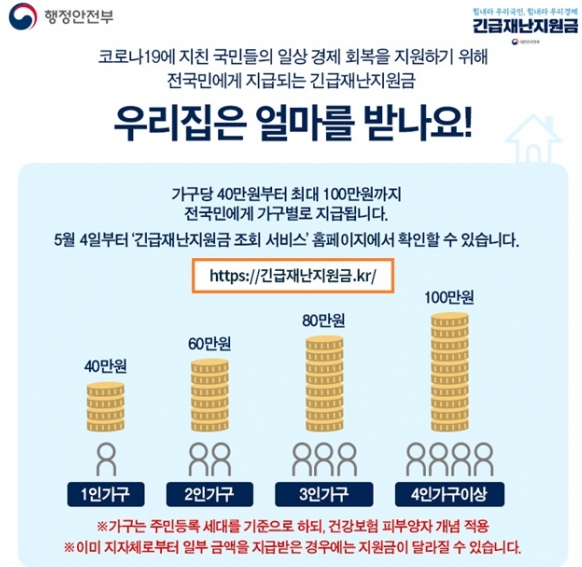 즉, 5차 재난지원금을 받을 수 있는 4인 가구는 월 소득이 975만 2580원 이하이면 신청자격에 해당되며 이 때 급여 외 근로소득, 사업소득, 재산소득, 이전소득 등을 모두 합한 금액입니다.