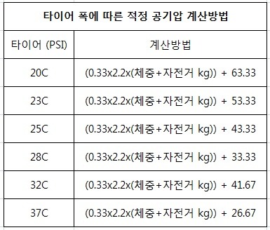 기본적으로 기온에 따라 추운날씨일수록 공기압은 적게 넣는것이 좋으며 타이어 두께 폭이 20C,23C,25C등 폭에 따라서 공기압 계산이 달라집니다.