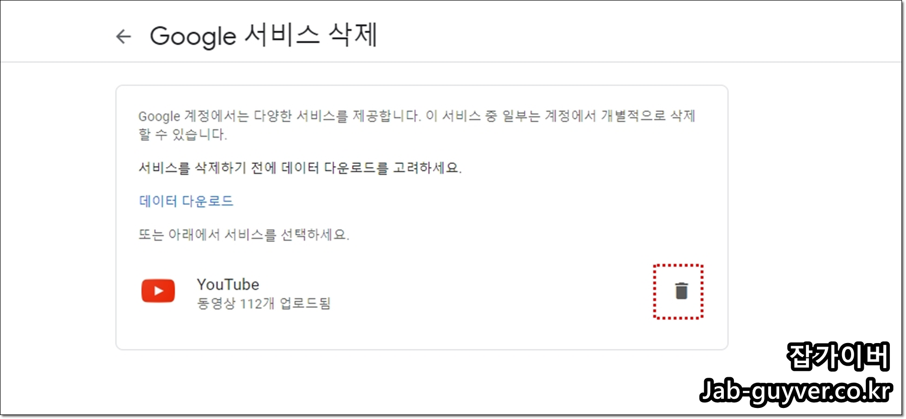 데이터 다운로드 또는 삭제항목에서 데이터 다운로드를 선택하면 구글계정의 구글포토나 유튜브 영상등을 다운로드 할 수 있습니다.