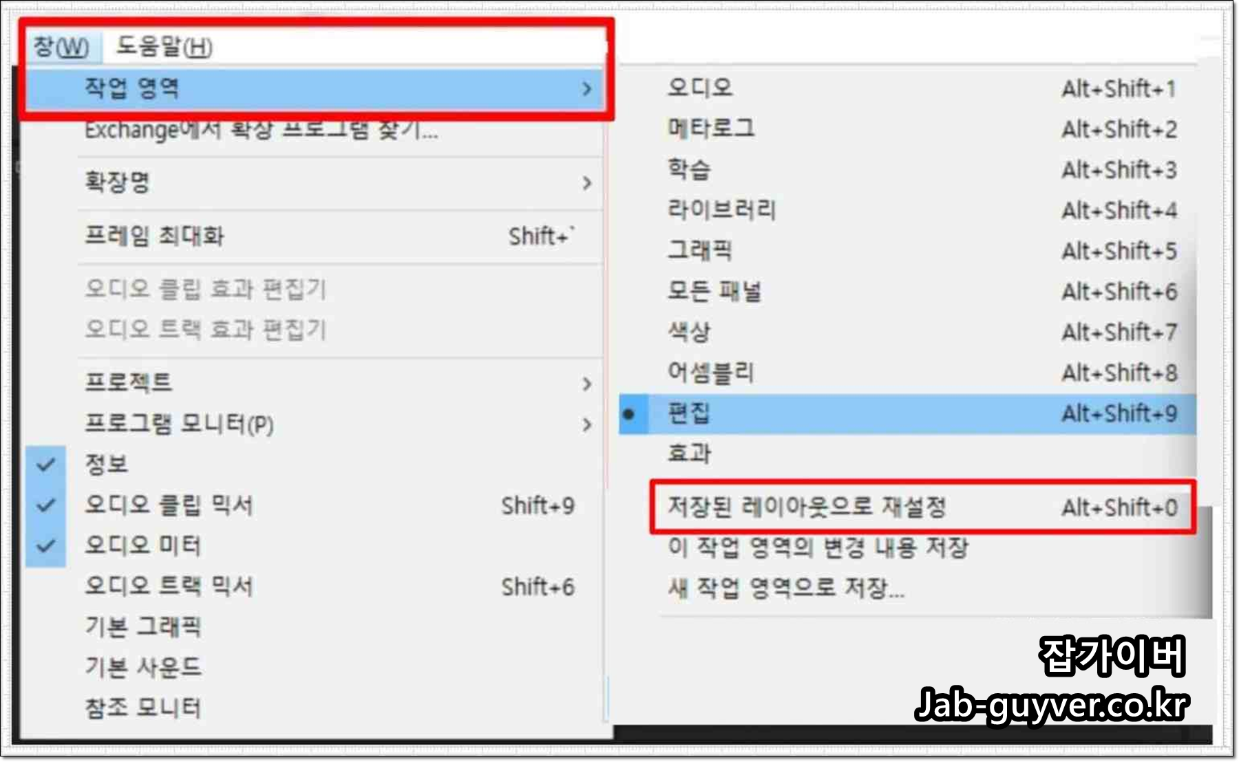 - 한글판 프리미어 초기화 : 창 -> 작업영역 -> 저장된 레이아웃으로 재설정