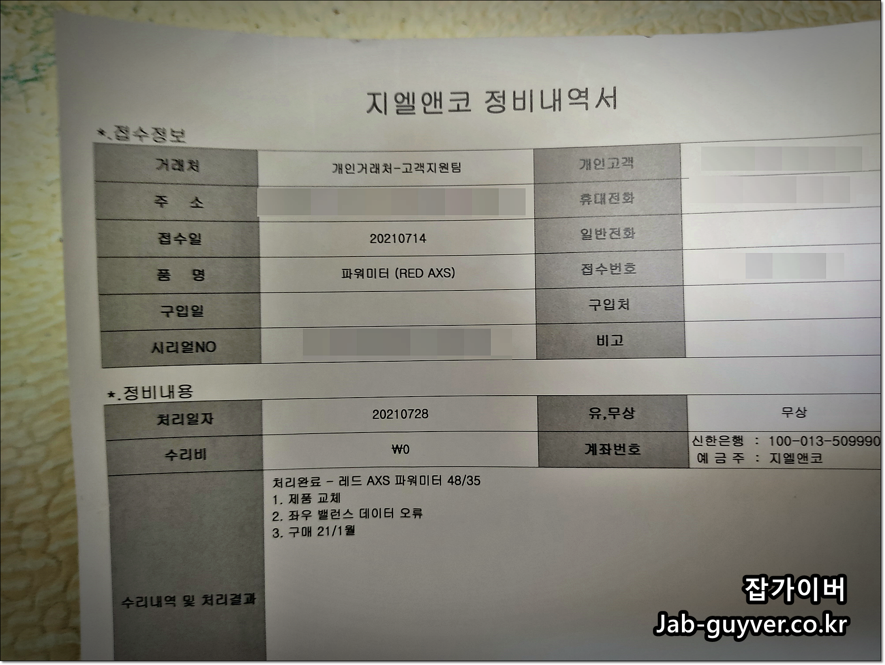 정비내역을 보면 SRAM RED ASX Powermeter 48/35 사용하던 그대로 받게디ㅗ었고 문제는 좌우 밸런스 데이터 오류로 제품을 무상으로 교환받아 별도의 수리비는 없었습니다.