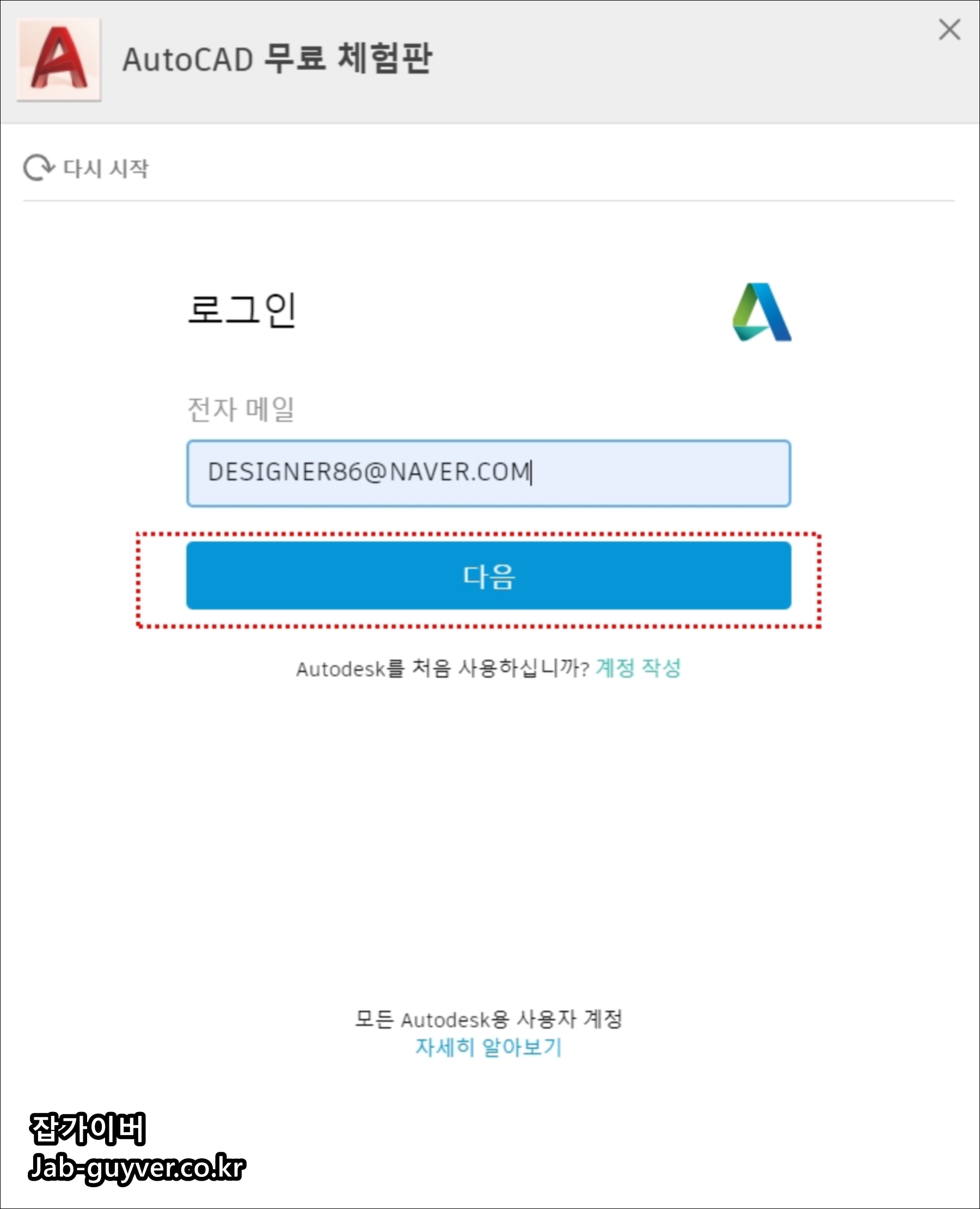 . 중간에 Autodesk 계정 로그인 창이 나오면 같은 계정으로 로그인해야 체험판 또는 교육용 권한이 정상 반영됩니다.