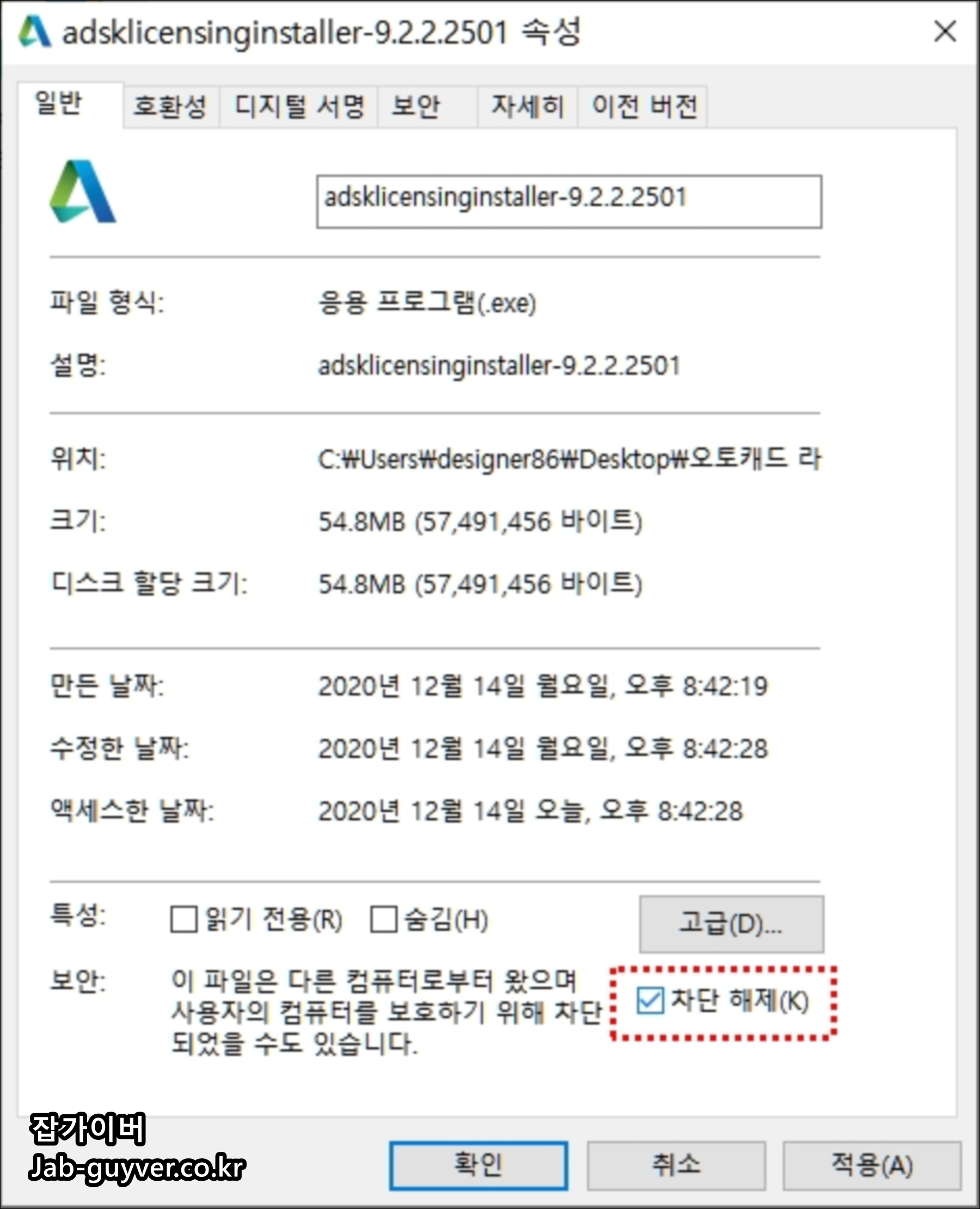 - 설치 파일 속성에서 차단 해제 체크