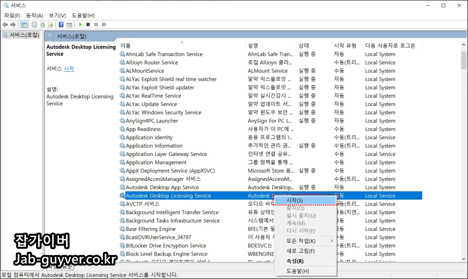 Autodesk Desktop Licensing Service 항목을 찾아 자동상태를 시작으로 변경합니다.