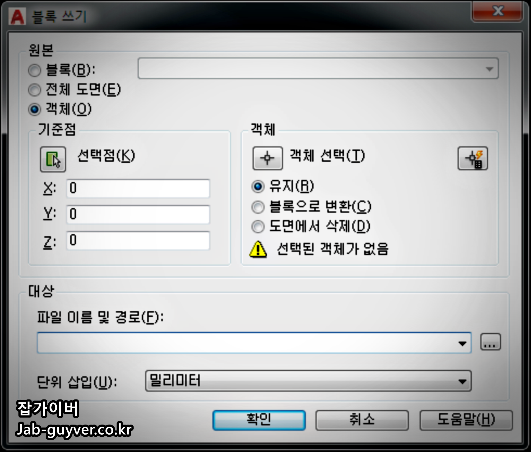 만약 전달해야 하는 도면에서 필요 없는 부분이 있다면 그런 부분은 제거하고 필요한 부분만 객체를 선택해 블록 저장 기능을 사용하면 도면을 이해하는데도 도움이 될 뿐만 아니라 Autocad의 데이터도 줄일 수 있습니다.