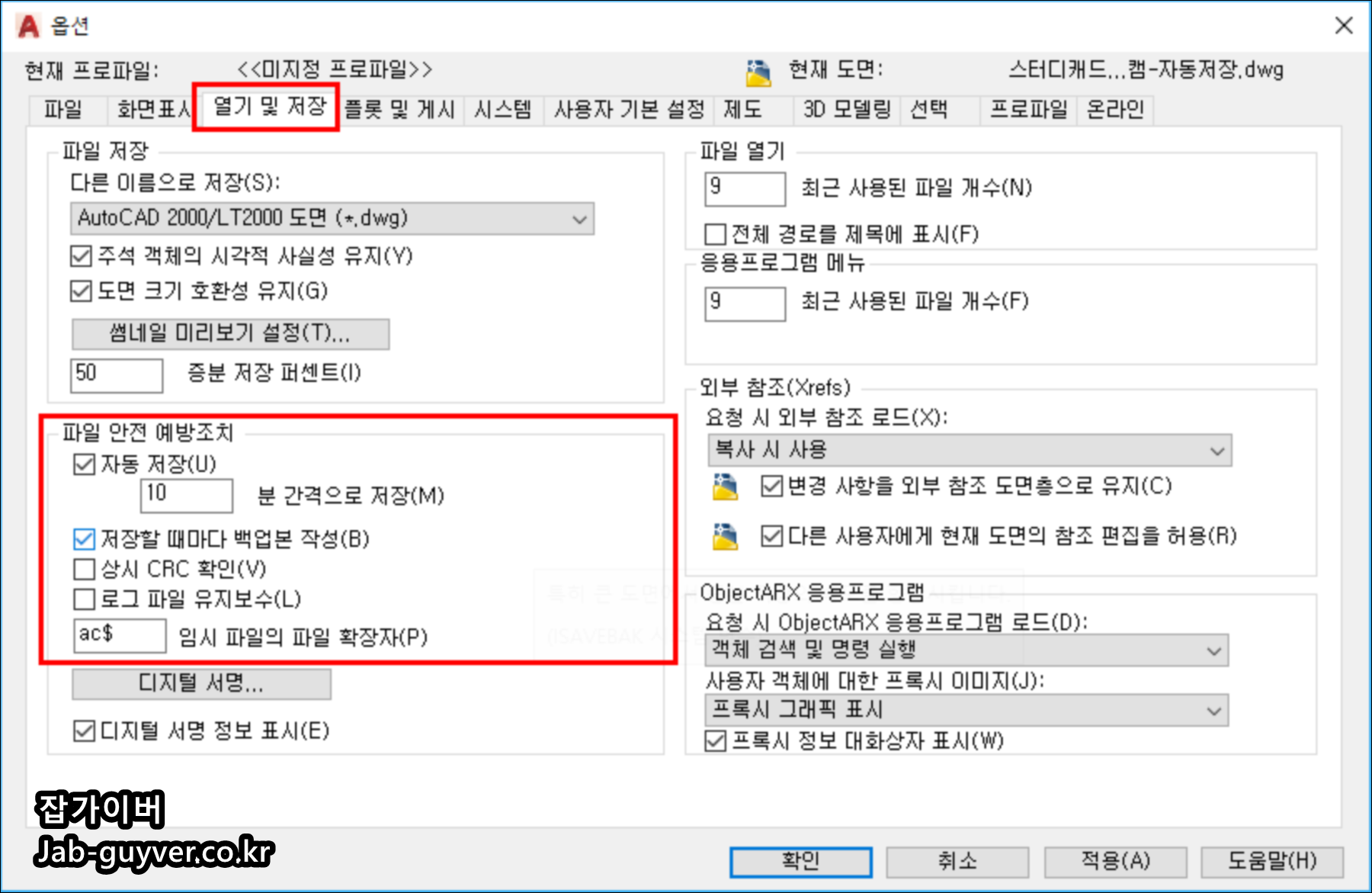 그렇기 때문에 옵션에서 ac& 파일을 dwg로 변경하면 자동저장된 파일의 확장자를 일일이 변경하지 않아도 됩니다.