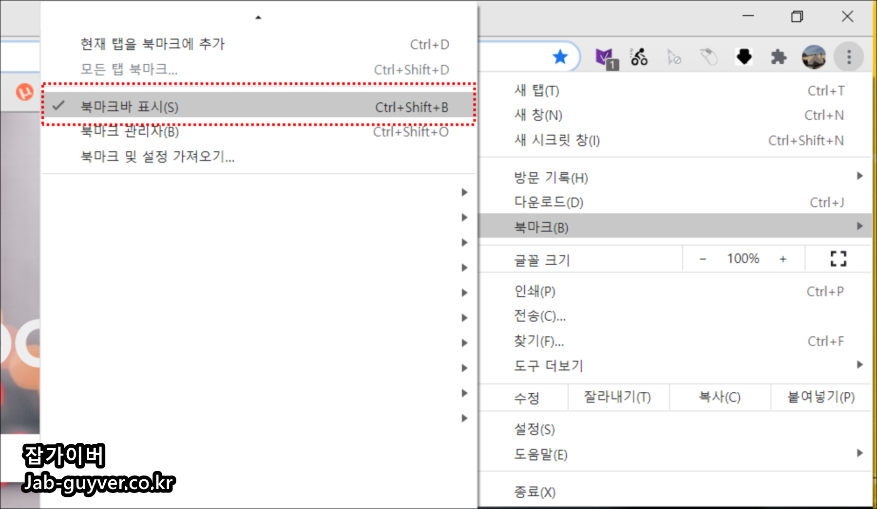 - 북마크바 표시를 선택합니다.
