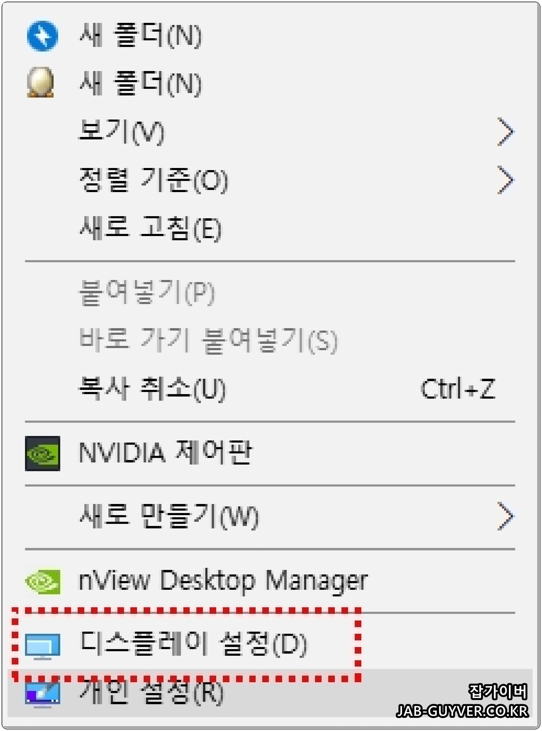 노트북을 USB 허브를 통해 모니터와 연결 후 윈도 바탕화면 빈 곳에서 마우스 우클릭 "디스플레이 설정"으로 들어갑니다.