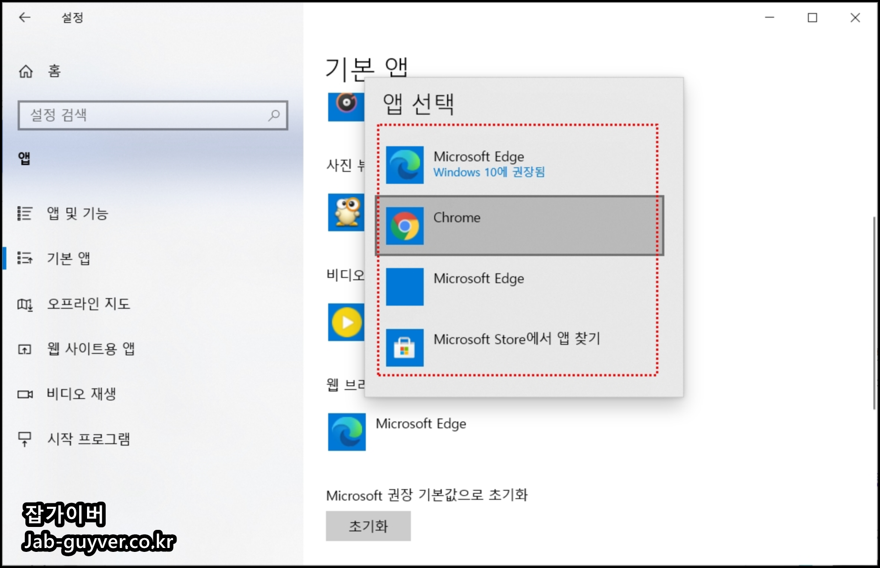 현재 마이크로소프트 엣지가 기본 웹브라우저로 설정되어 있습니다.