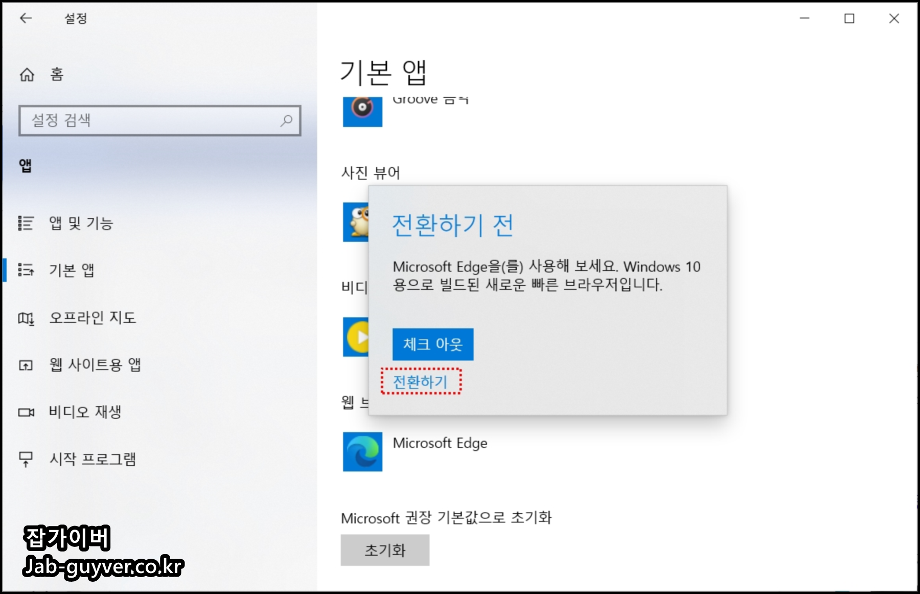 사파리나 마이크로소프트 엣지,인터넷 익스플로러,구글 크롬등 설치되어 있는 인터넷 브라우저 중에서 기본으로 사용하고 싶은 앱을 선택하고 전환을 선택합니다.