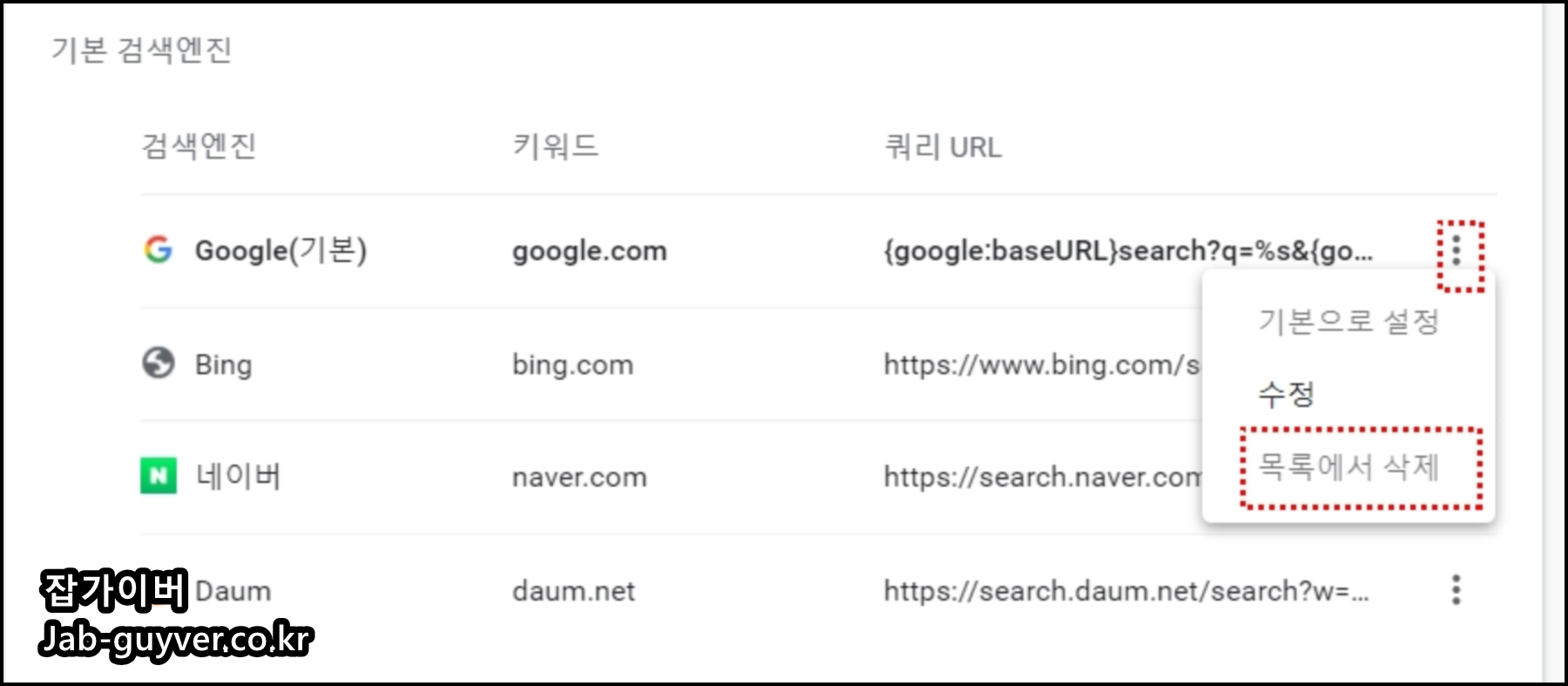 기본적으로 크롬에서 제공하는 검색엔진은 5가지 입니다.