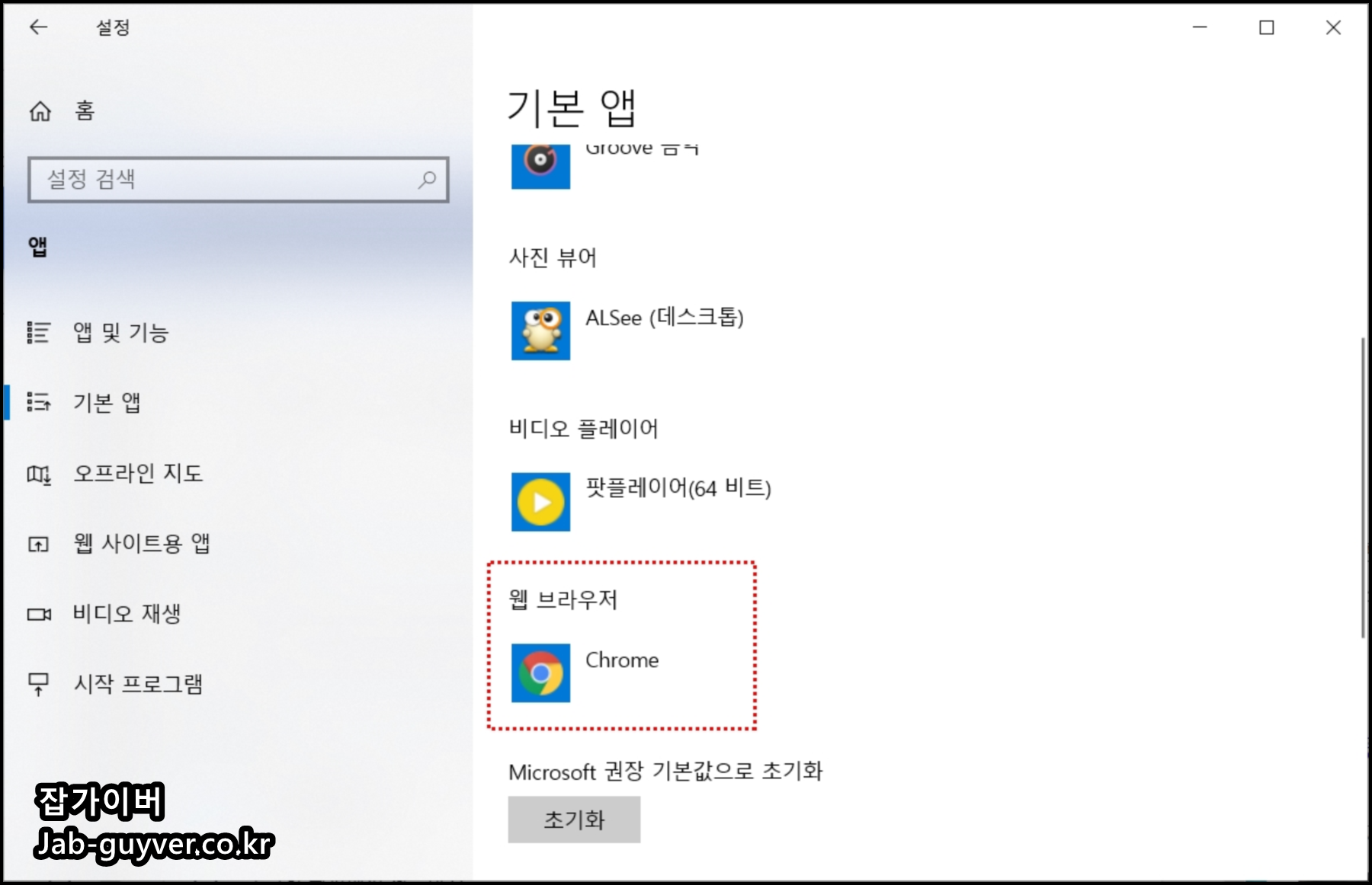 윈도우 -> 기본앱에서 웹브라우저를 선택합니다.