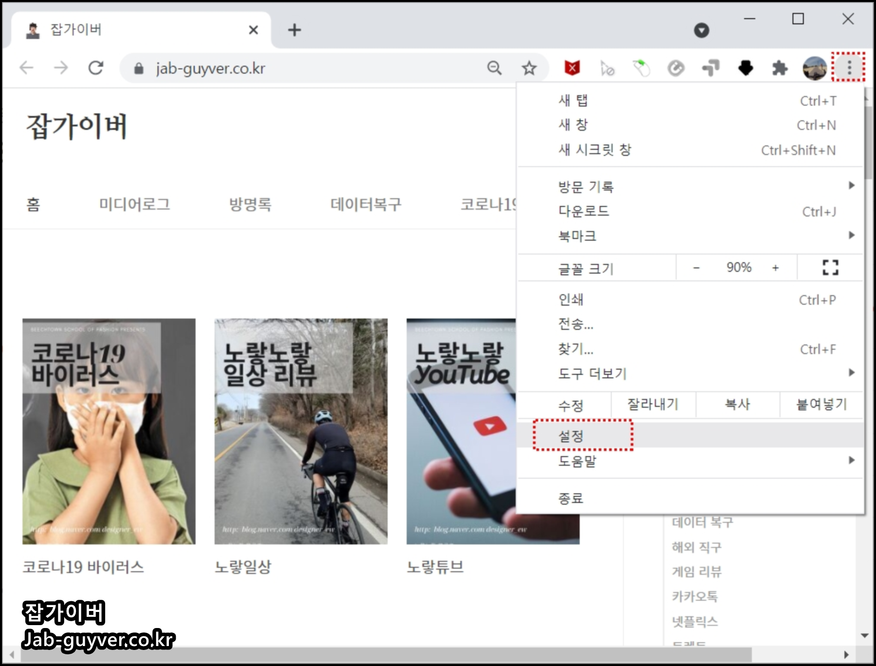 우측상단 점3개 -> 설정으로 들어갑니다.