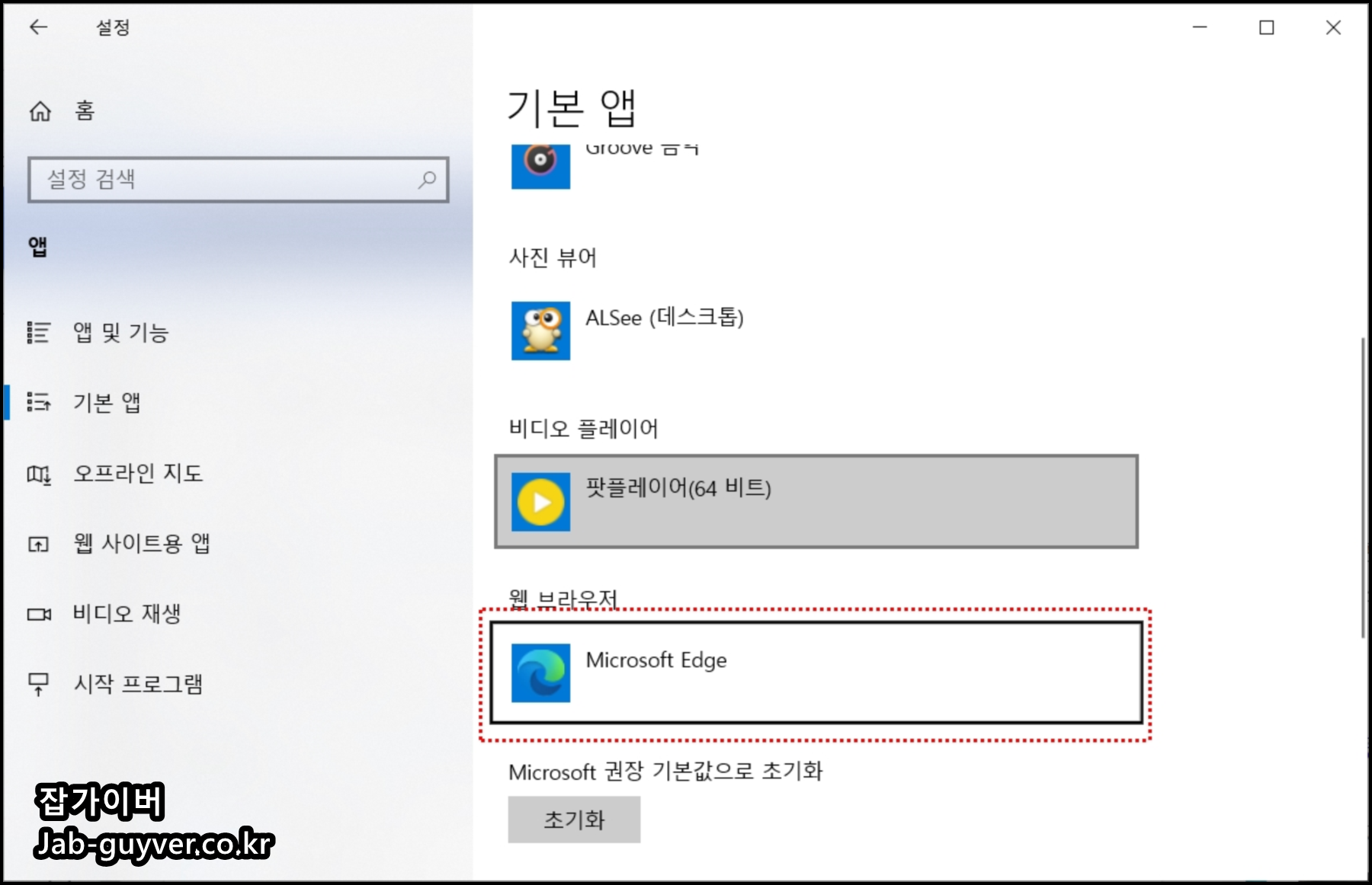 현재 마이크로소프트 엣지가 기본 웹브라우저로 설정되어 있습니다.