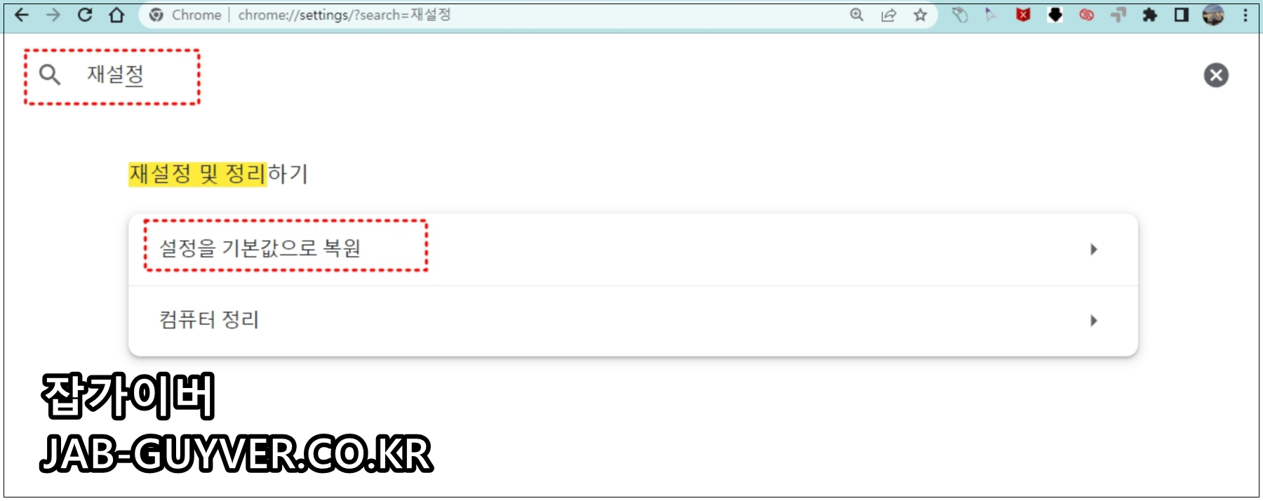 이후에도 문제가 해결되지 않는다면 크롬 초기화를 통해 설정을 처음 설치했던 상태로 되돌린 다음 진행합니다.