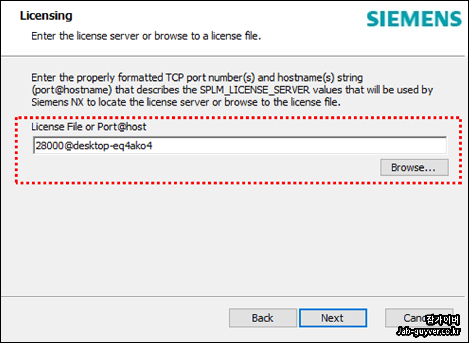 가장중요한 라이센싱 서버 포르를 설정하는부분으로 기존 28000번 포트를 27800 포트로 변경해야합니다.