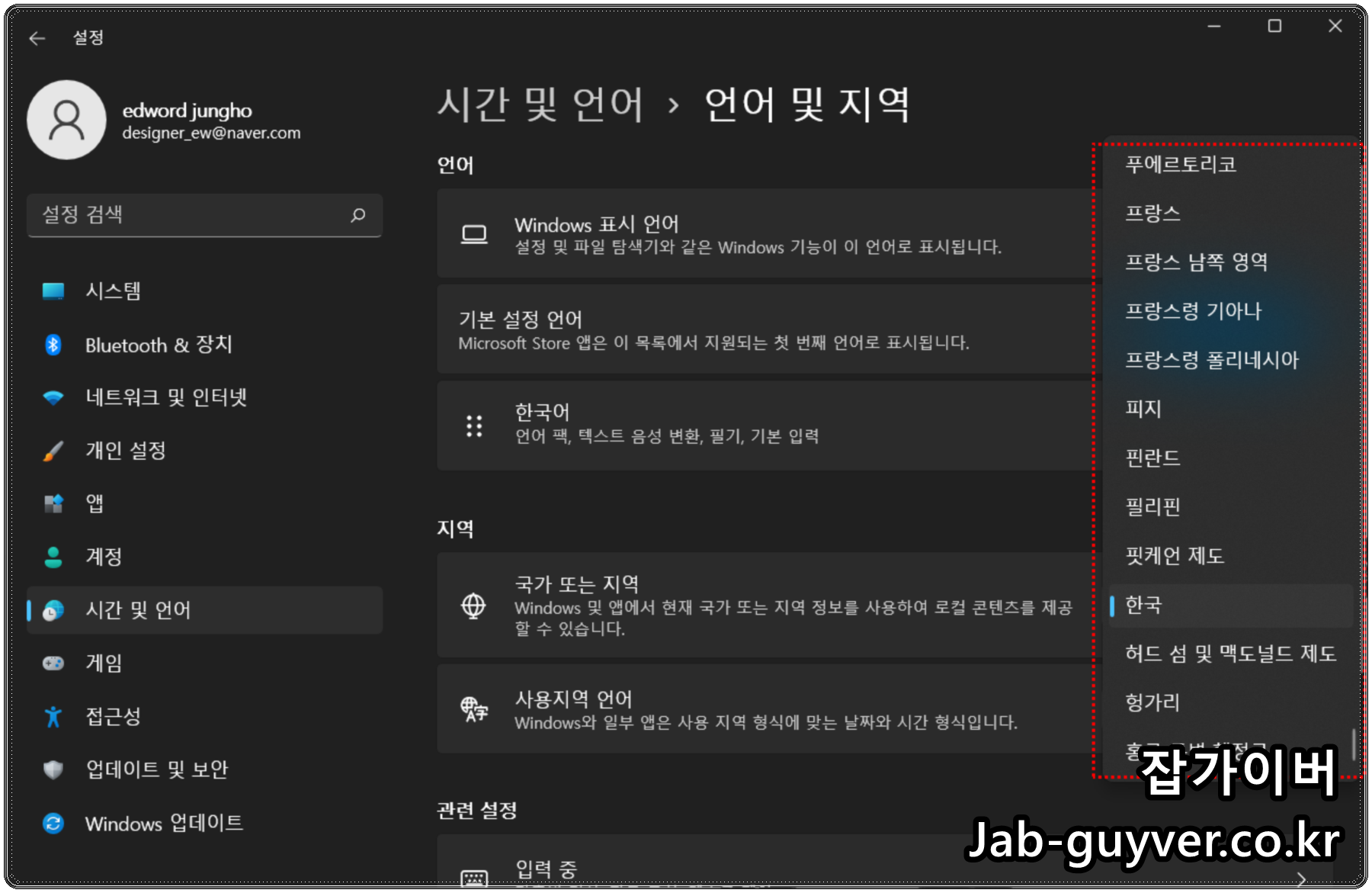 윈도우11 시간 날짜 오류 동기화 설정 - 국가 언어설정 변경