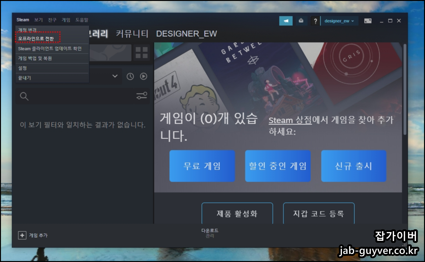 우선 정식 스팀게임이 아닌경우에는 스팀에 로그인 후 오프라인으로 전환을 사용하느것을 권장합니다.