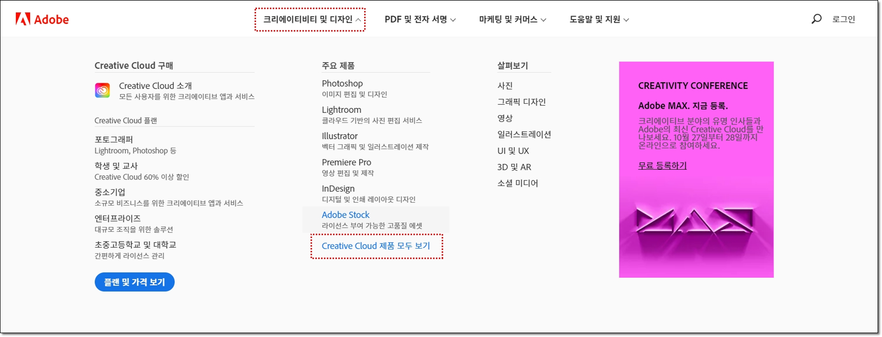 상단 메뉴 -> 크리에이비티 및 디자인 -> Creative Cloud 제품 모두보기를 선택합니다.