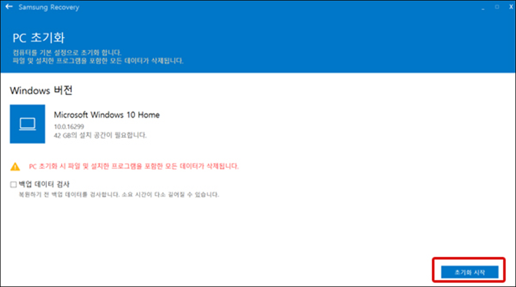 - PC 초기화 시 파일 및 설치한 프로그램을 포함한 모든 데이터가 삭제됩니다.