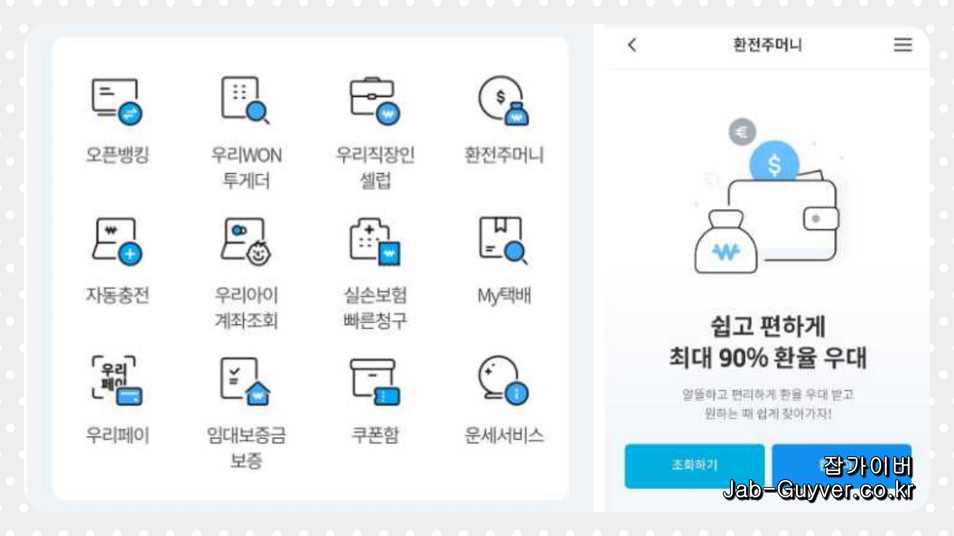 우리은행에서 달러환전 수수료를 절약하기 위해서는 우리은행 앱을 통해 환전주머니 기능을 사용하면 최대 90%까지 환율우대를 받을 수 있습니다.
