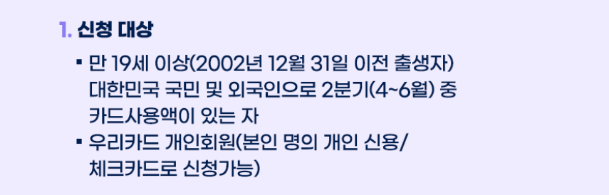 - (신청불가 카드) 법인카드/가족카드/선불 또는 직불카드/겸영여신업자 중 유통업자가 발행한 백화점카드/ - 전자금융업자(핀테크사) 등이 발행하는 각종 Pay(제로페이 포함)/증권사CMA결제카드/OCTO우리V카드/