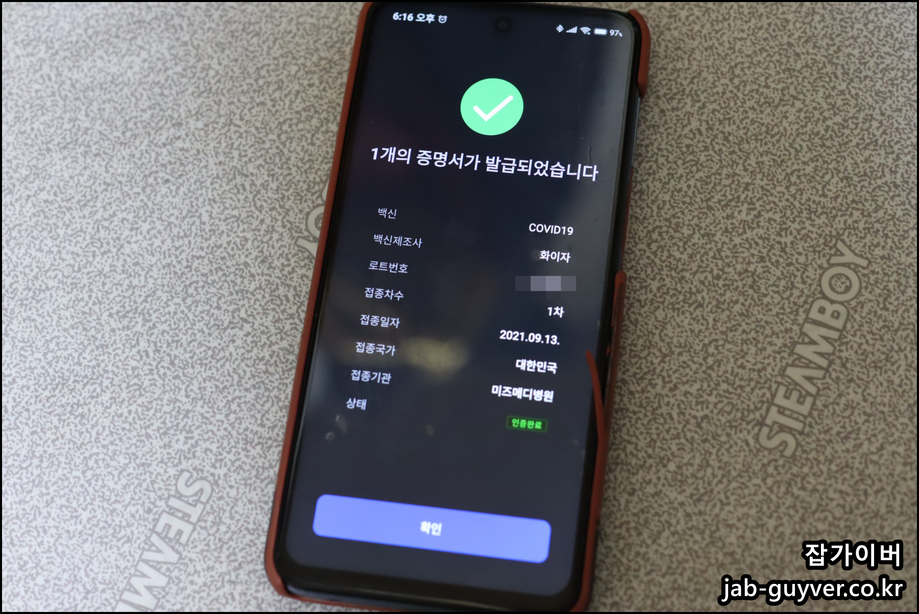 현재 1차 백신 예방접종 증명서로서 언제 백신을 맞았는지 백신제조사와 접종일자 그리고 접종차수를 확인가능한