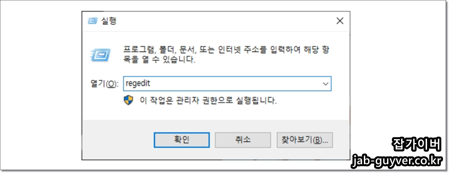 REGEDIT 입력 후 엔터 "레지스트리 편집기"를 실행합니다.