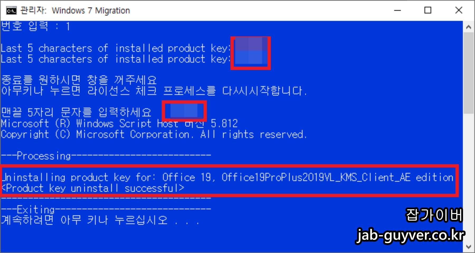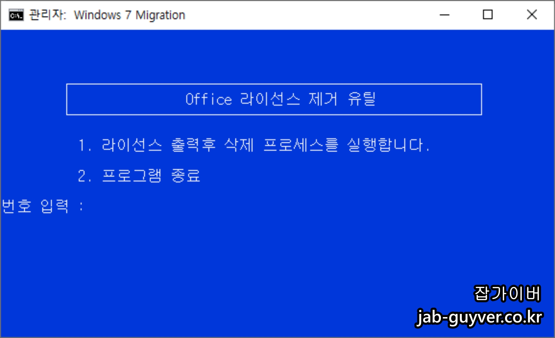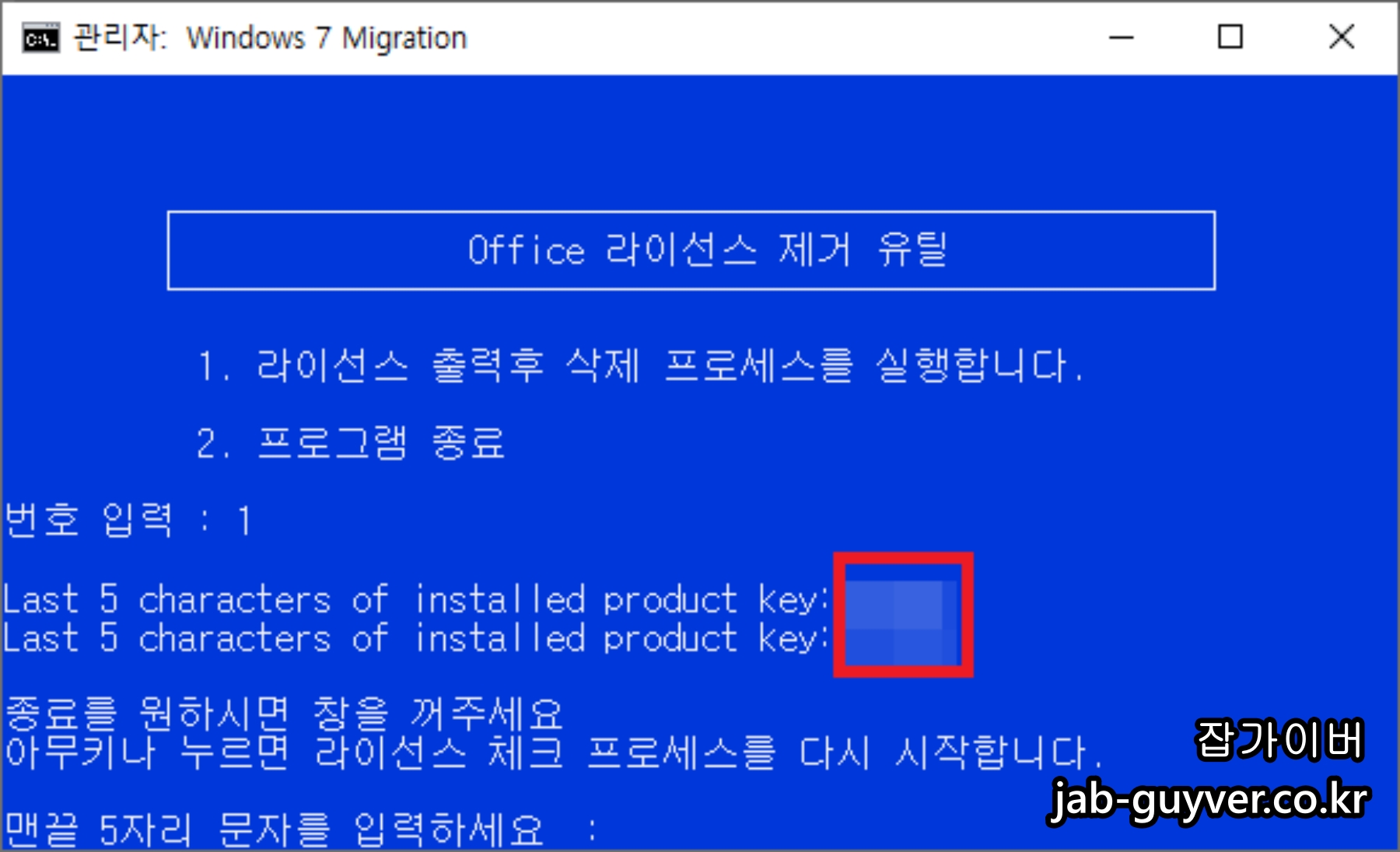 오피스 라이센스 제거 유틸리티 실행 후 1번을 눌러주면 현재 오피스 라이센스 제품키 끝 5자리를 확인할 수 있습니다.