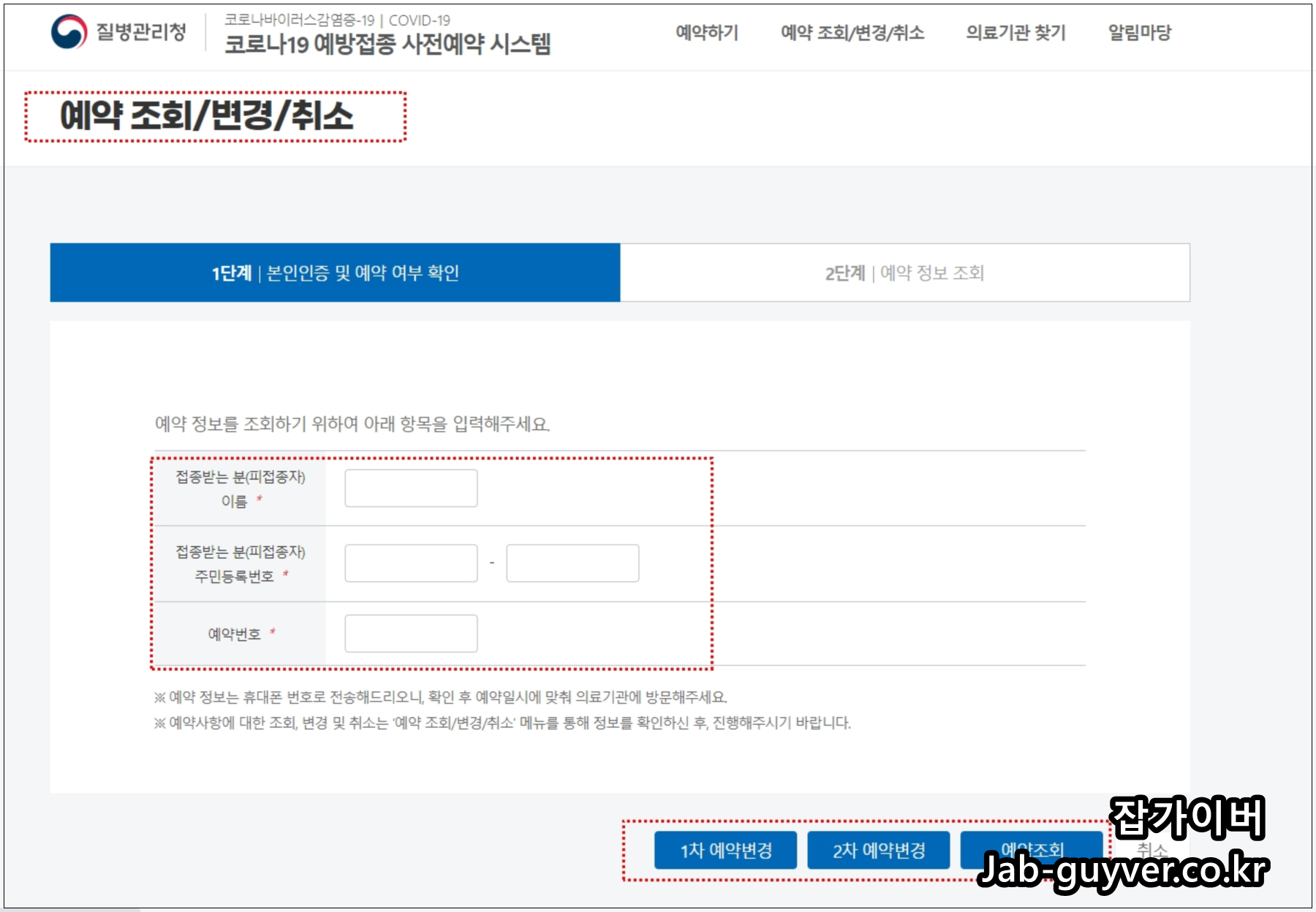 접종받는 본인 이름과 주민등록번호 그리고 백신 예약번호를 입력하고 예약변경 및 예약조회를 진행할 수 있습니다.