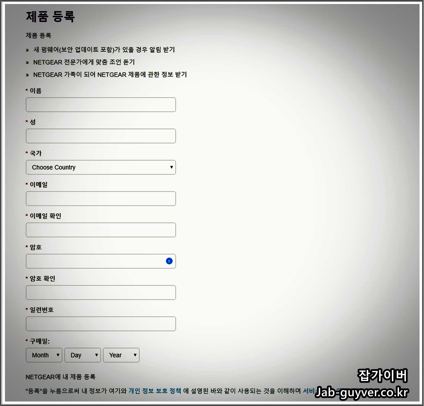 이름 및 이메일,국가, 암호,일련번호, 구매일등을 등록합니다.