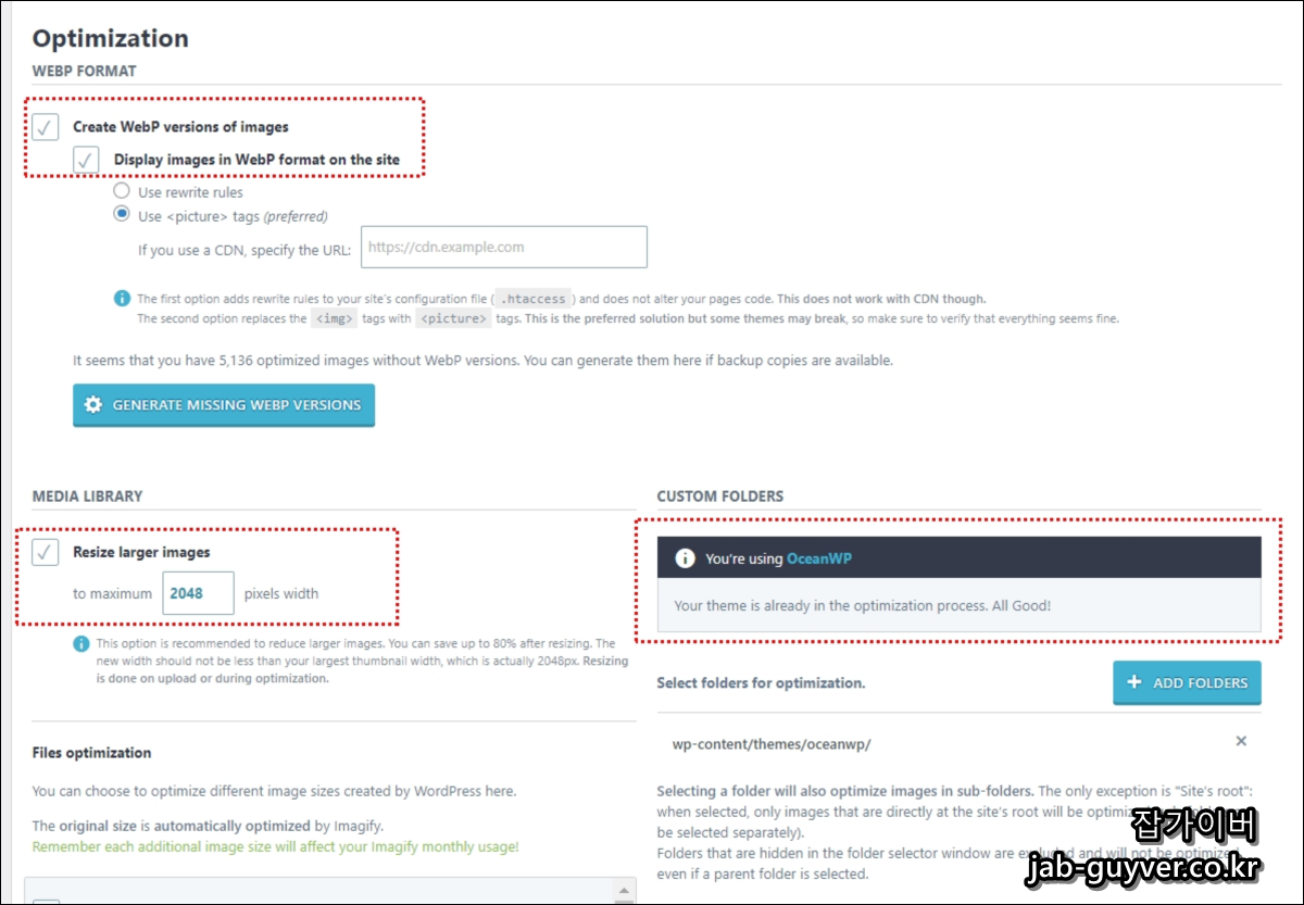 최적화는 테마에 포함된 이미지, 플러그인 및 "사용자 지정 폴더" 설정을 통해 미디어 라이브러리 폴더 외부에 있는 이미지에도 적용됩니다.