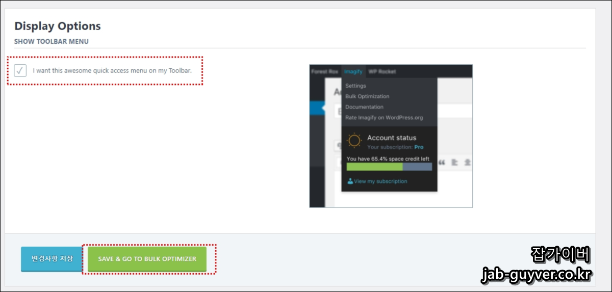 플러그인을 설치하면 상단에 imagify 탭이 추가됩니다.