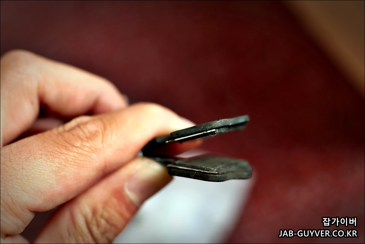 그렇게 분해한 디스크 브레이크 패드를 확인하니 아직 패드가 남아있는걸 볼 수 있습니다.