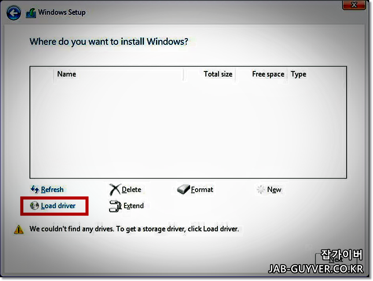 Load Driver를 선택해서 앞서 저장한 usb 부팅디스크 폴더의  Intel Rapid Storage Technology(IRST) 폴더를 지정해주면 설치할 드라이브 파티션이 표시됩니다.