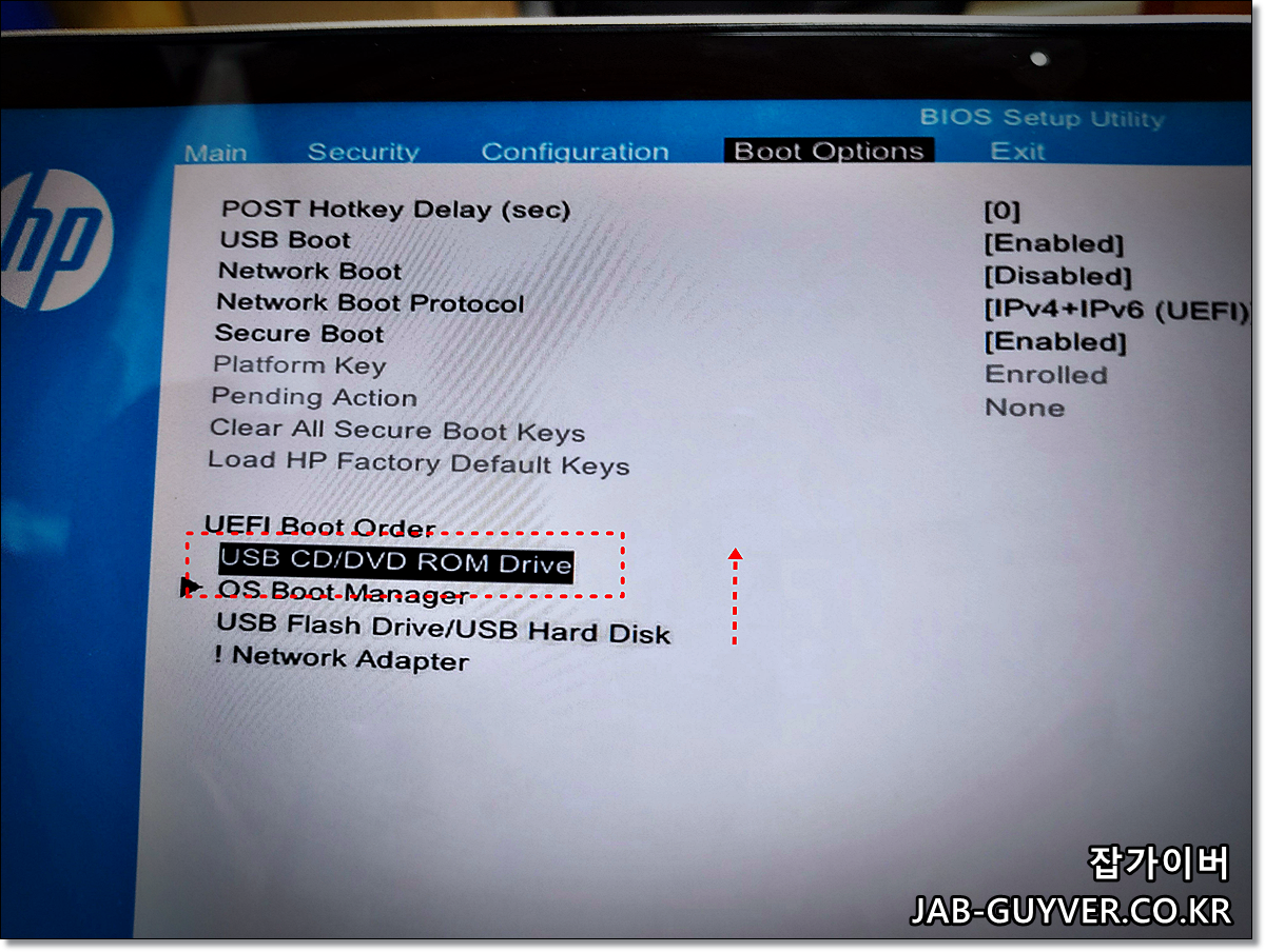 HP노트북 프리도스의 경우 부팅 시 F9를 눌러 부팅설정에서 USB를 선택합니다.
