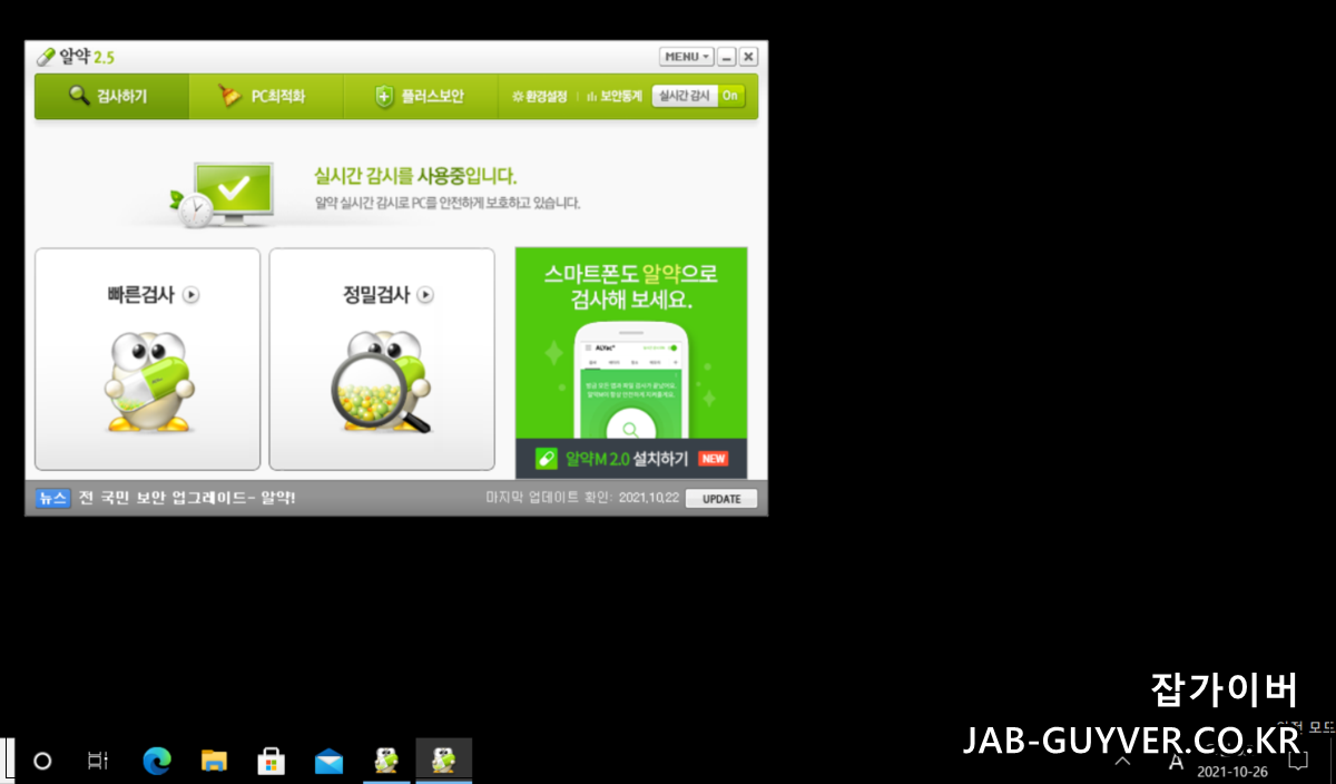 하지만 그렇게 하더라도 문제가 해결되지 않는다면 윈도우 안전모드 부팅이나 관리자계정인 "Administrator"로 로그인 후 알약으로 정밀검사를 실행합니다.