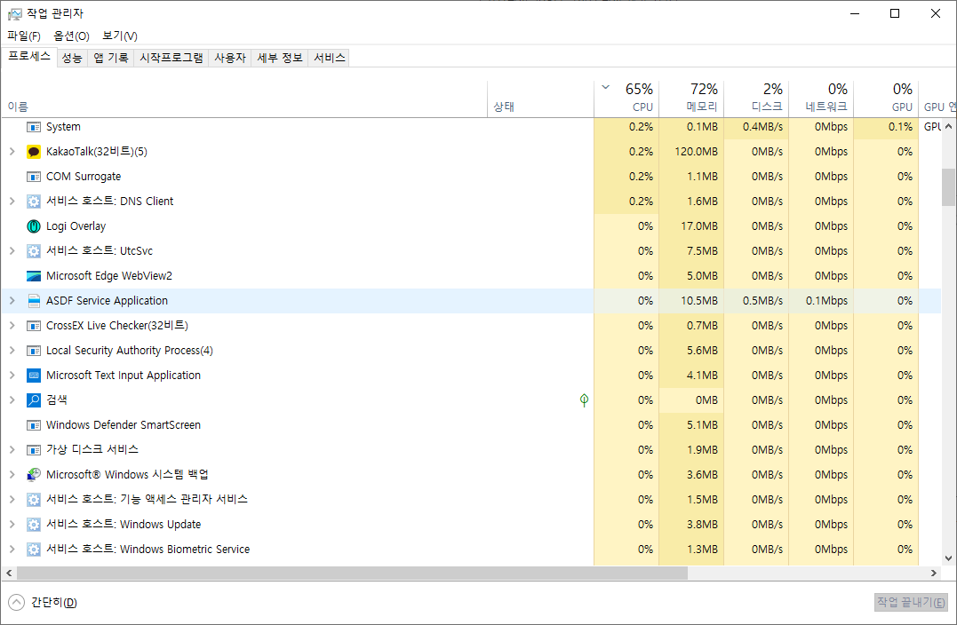 작업 관리자를 열고(Ctrl + Shift + Esc), 실행 중인 프로세스 중 의심스러운 항목을 확인합니다.