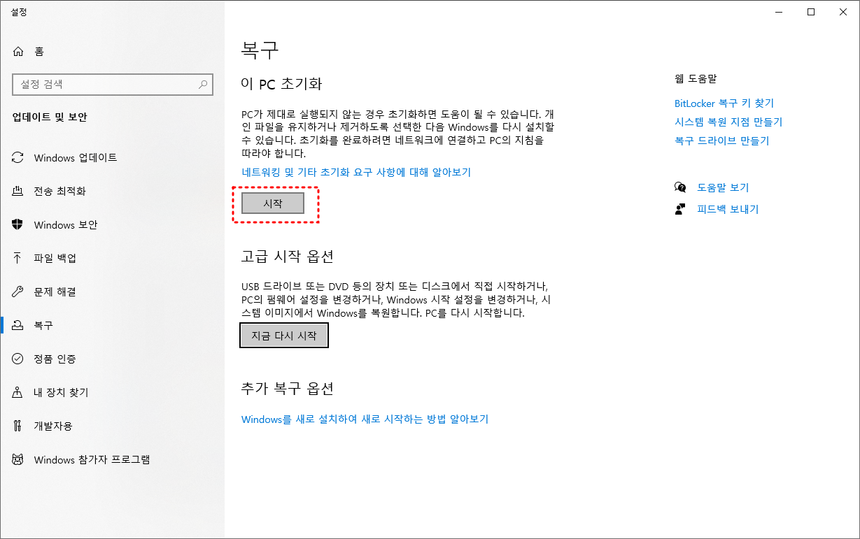설정 > 시스템 > 복구 > 이 PC 초기화로 이동하여 필요 시 개인 파일을 유지하거나 삭제하고, 시스템을 초기화합니다. 초기화는 백도어를 완전히 제거할 수 있는 가장 강력한 방법입니다.