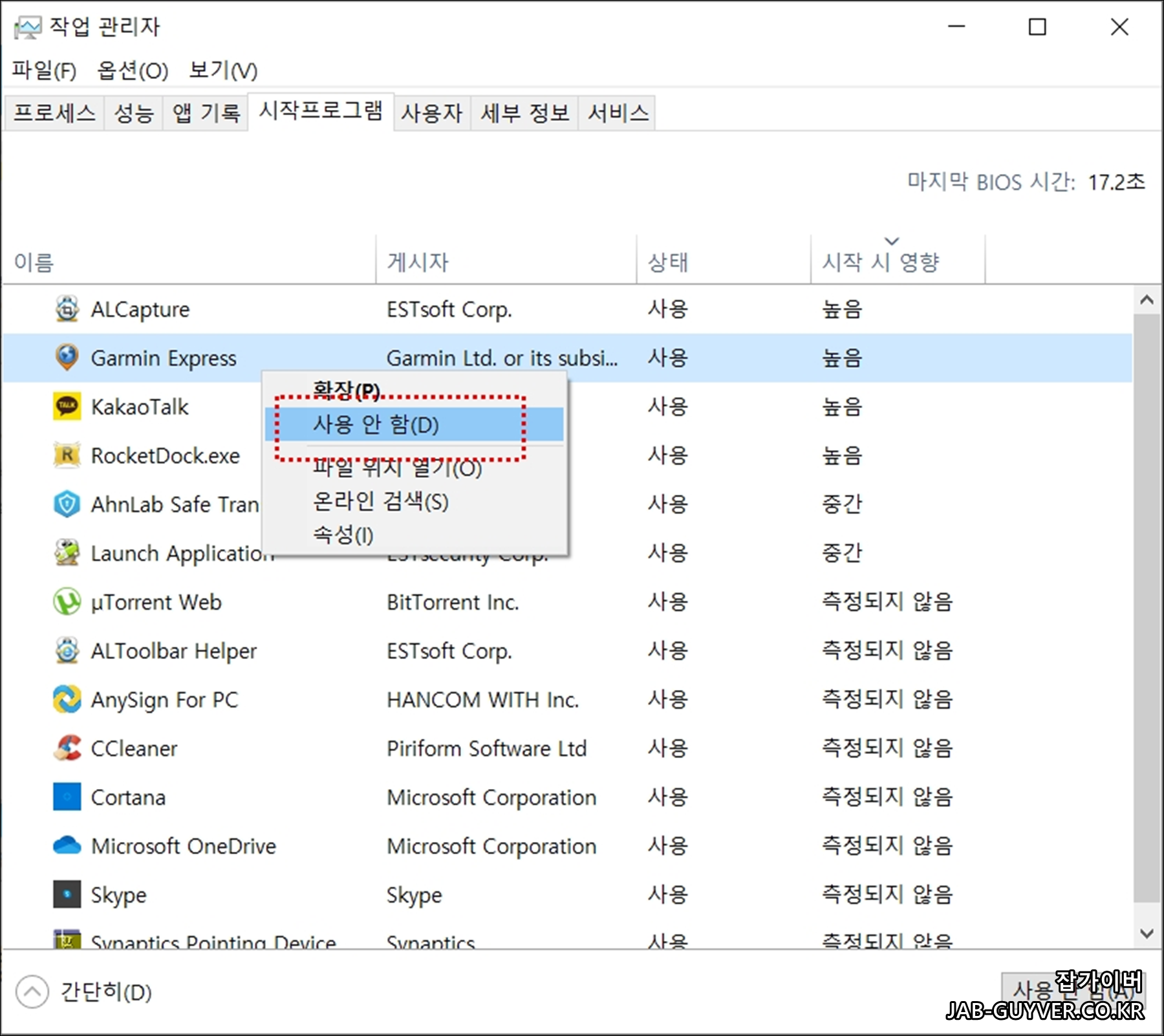 그리고 컴퓨터 부팅시 리소스를 많이 잡아먹는 프로그램을 확인해서 컴퓨터 부팅시 실행되지 않도록 합니다.