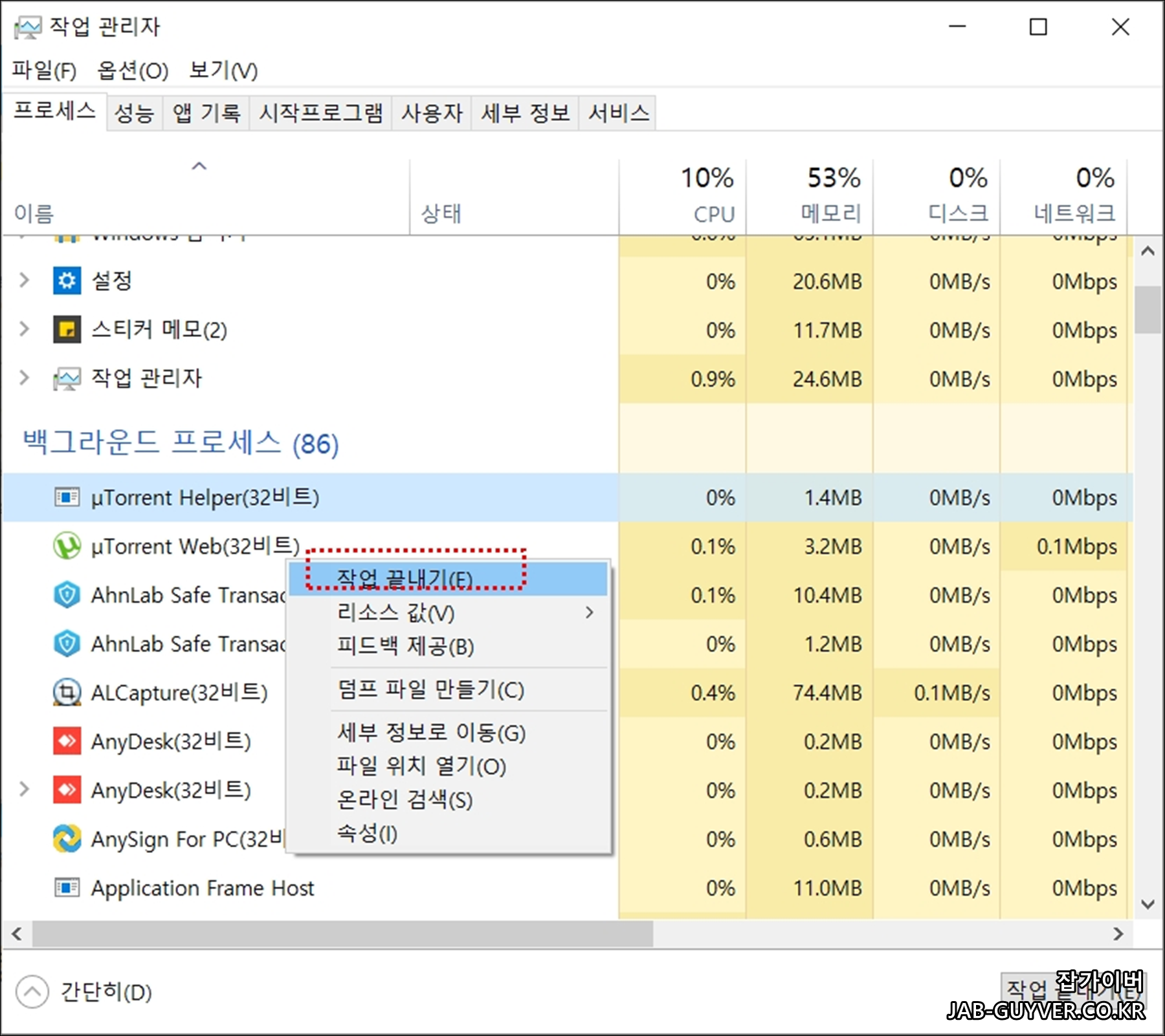 그럼 현재 실행중인 프로그램중에서 CPU와 메모리 디스크, 네트워크 사용량이 높은 프로그램이 있다면 작업끝내기를 눌러 종료합니다.