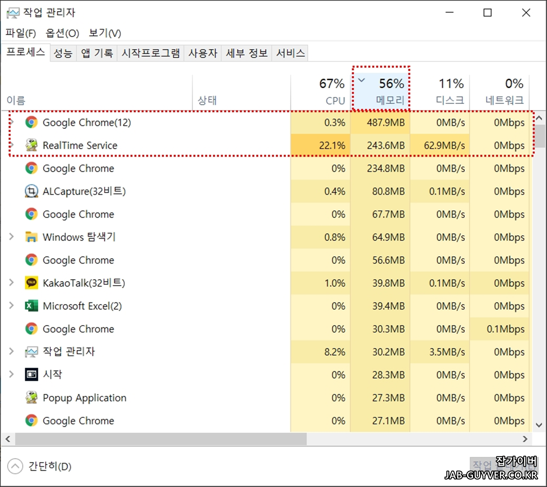 자기도 모르게 무거운 프로그램을 많이 사용하고 있다면 컴퓨터가 느려지게 되는데 필요없는 프로그램중 cpu나 메모리 사용량이 많은 앱을 찾아 삭제하거나 실행을 중지합니다.